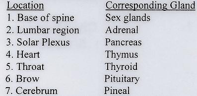 An aura is created by different energy systems existing in the body which contribute to the formation of this electromagnetic field. In addition to nerves and blood circulation there are many subtle energy pathways that exist in the body. Chinese medicine describes 72,000 main paths, which include the acupuncture meridians, the circulating blood, the spine and the nerves. The brain is the North Pole and the end of the spine is the south pole of the human energy field. The main axis is the spine, around which the electromagnetic field forms. Because the energy pathways run parallel to each other, they mutually induce and reinforce each other. The energy currents must be in phase and in harmony for this process of induction and reinforcement to be maintained. A person balanced in body, mind, and soul has a larger magnetic field.The homeostasis of the body is the primary function of the spine. Along this axis you will find a majority of the nerve points for the organs as well as the subtle power centers and chakras which can be seen as points of light along the spine. On the human physical plane, the chakras manifest themselves through the endocrine glands, which regulate all physical and emotional functions. The following shows the location of the chakras and corresponding glands.